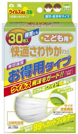 白元无纺布一次性口罩采用立体三层结构,中间层为高密度过滤层,周边为密贴构造,可完全与脸及下巴紧贴,无空隙,能阻挡99%直径0.1微米颗粒,有效过滤细菌病毒及飞沫。阻隔味道的效果也不错,没有异味。儿童系列为不含鼻部软骨条设计,柔软宽大的耳绳,减轻孩子耳部的负担。又雾霾也不怕,孩子的坚实保护盾。价格便宜,凑单好品。