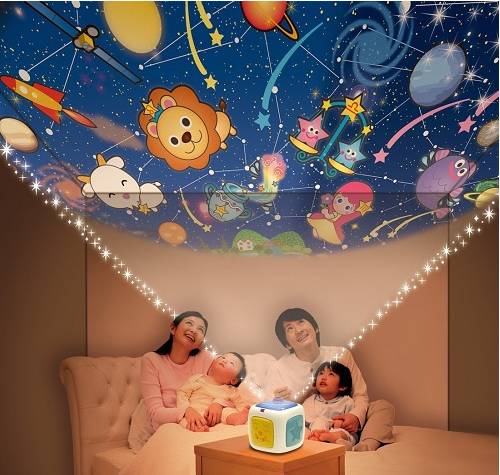 宝宝、成人都适用的投影仪。对宝宝可帮助入眠,对成人,可缓解紧张情绪,解压。距离天花板2.4米距离投影,投影面积可达直径3.8米,家庭影院效果(镜头可调焦距)。采用LED灯光投影、清晰、明亮,不放碟片也可播放25首曲目,可定睡眠关闭。不含电池,可以放心转运。